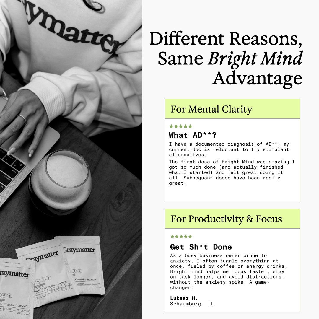 Graymatter Bright Mind: Daily plant-based nootropic drink mix for calm, focused energy - without the prescription or the side effects.